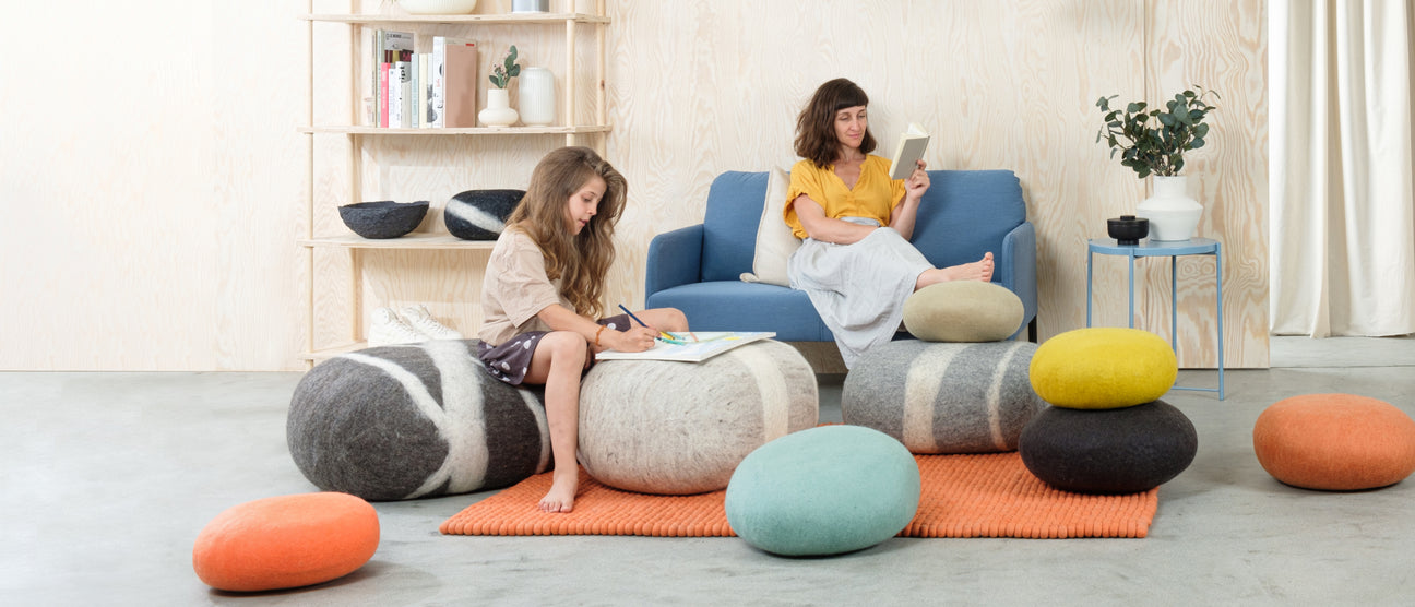 Jednokolorowe pufy myfelt i realistycznie wyglądające filcowe kamyczki doskonale sprawdzają się nie tylko jako wysokiej jakości elementy dekoracyjne w salonie. Są również popularne jako wygodne i naturalne poduszki do siedzenia lub miękkie taborety do treningu autogennego, jogi i medytacji i są dostępne w różnych rozmiarach.