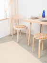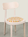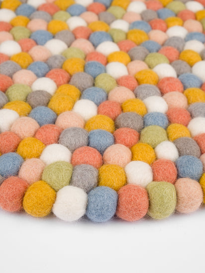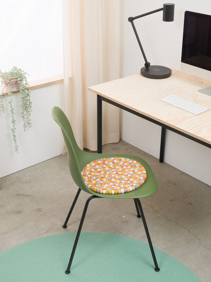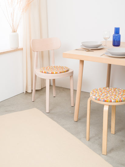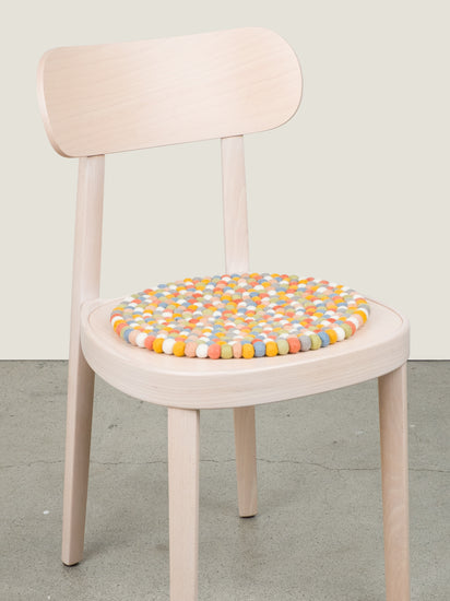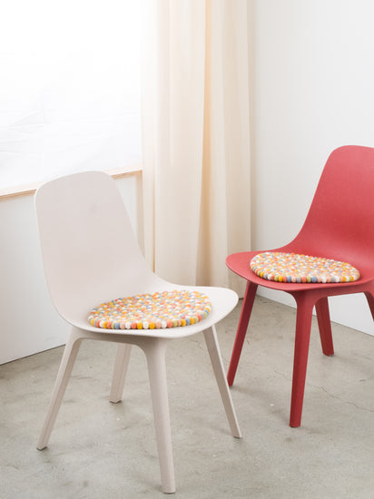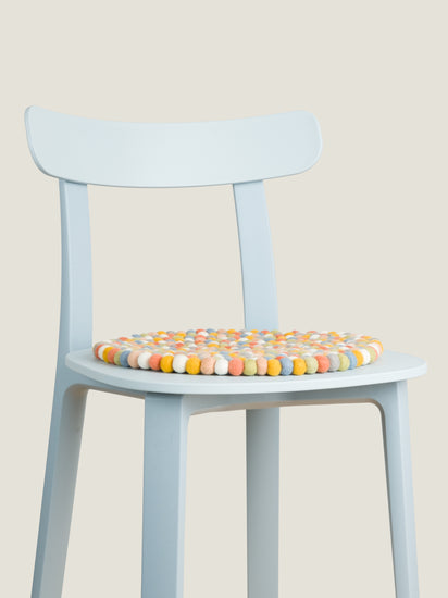 Okrągła, wielobarwna poduszka na siedzisko wykonana z czystej wełny dziewiczej.