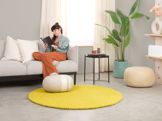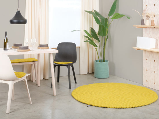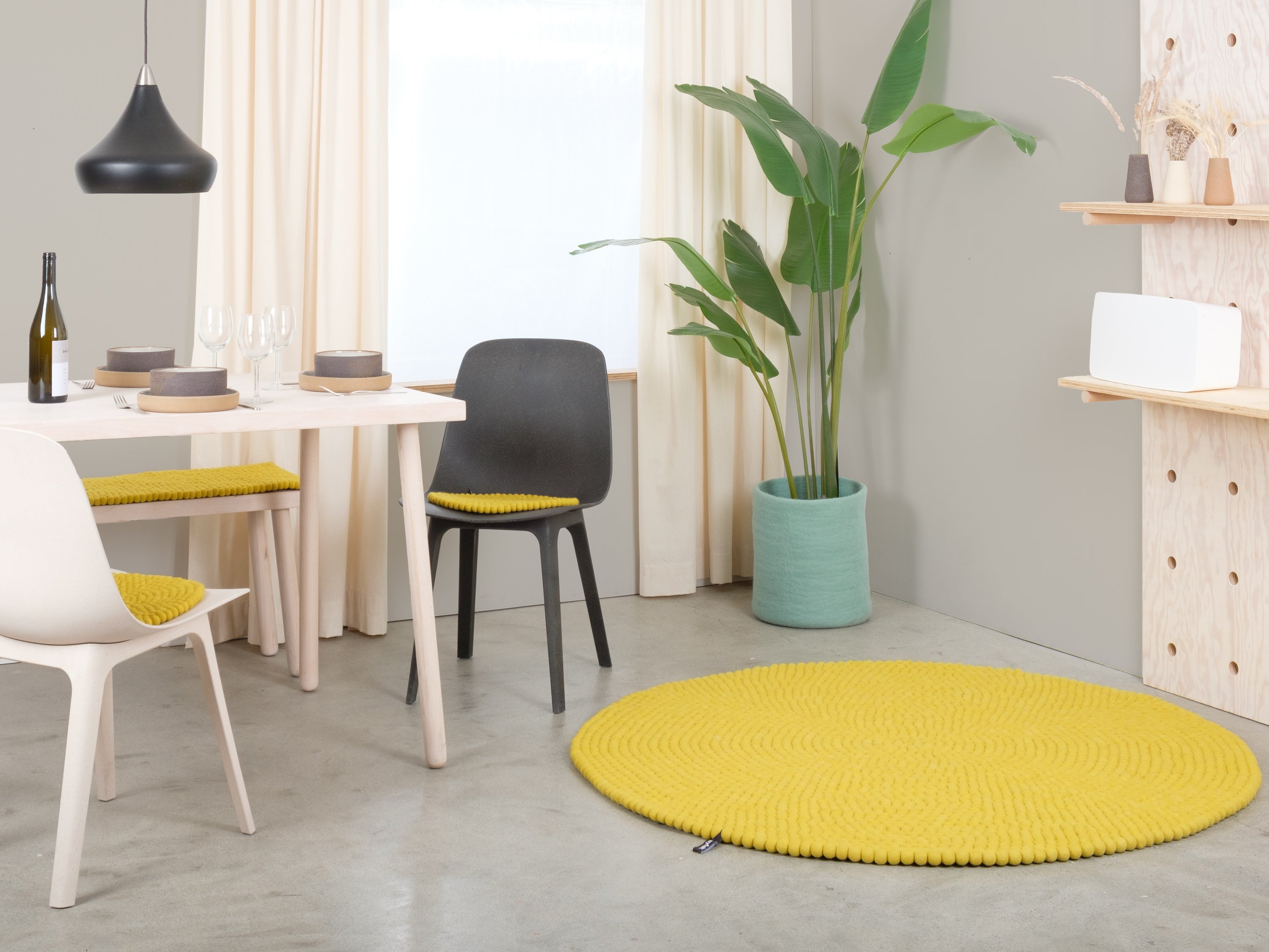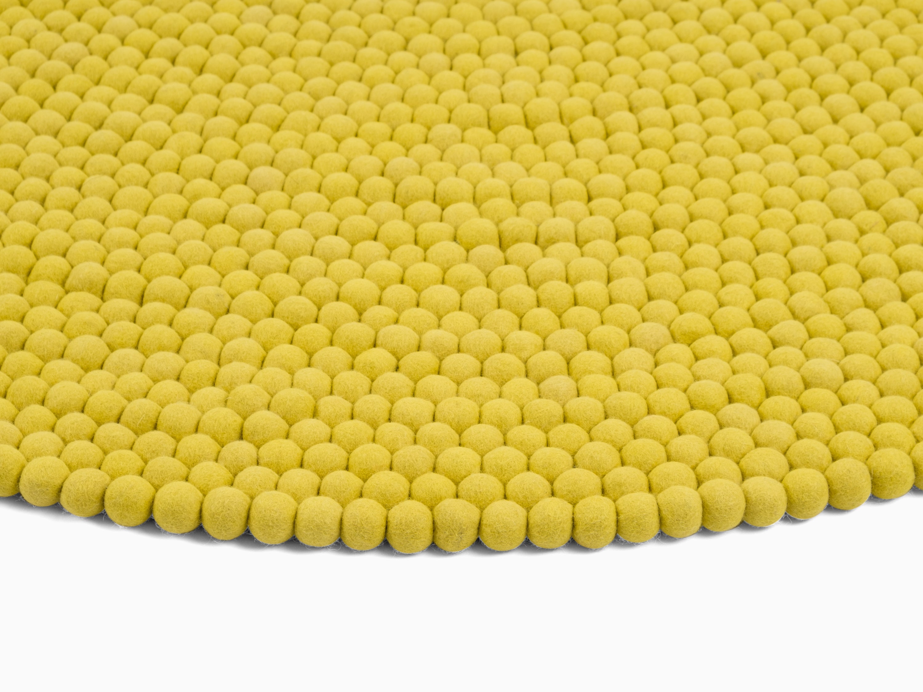Kata to dywan z kulek filcowych w świeżej żółtozielonej barwie. Jasny, pełen energii i witalności, wnosi ruch do wnętrza. Jako radosny akcent w salonie lub punkt świetlny w przestrzeni do pracy. Kata dodaje lekkości i życia. Miękki, trwały i łatwy w pielęgnacji. Ręcznie wykonany w Nepalu ze 100% czystej wełny dziewiczej.