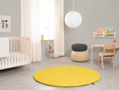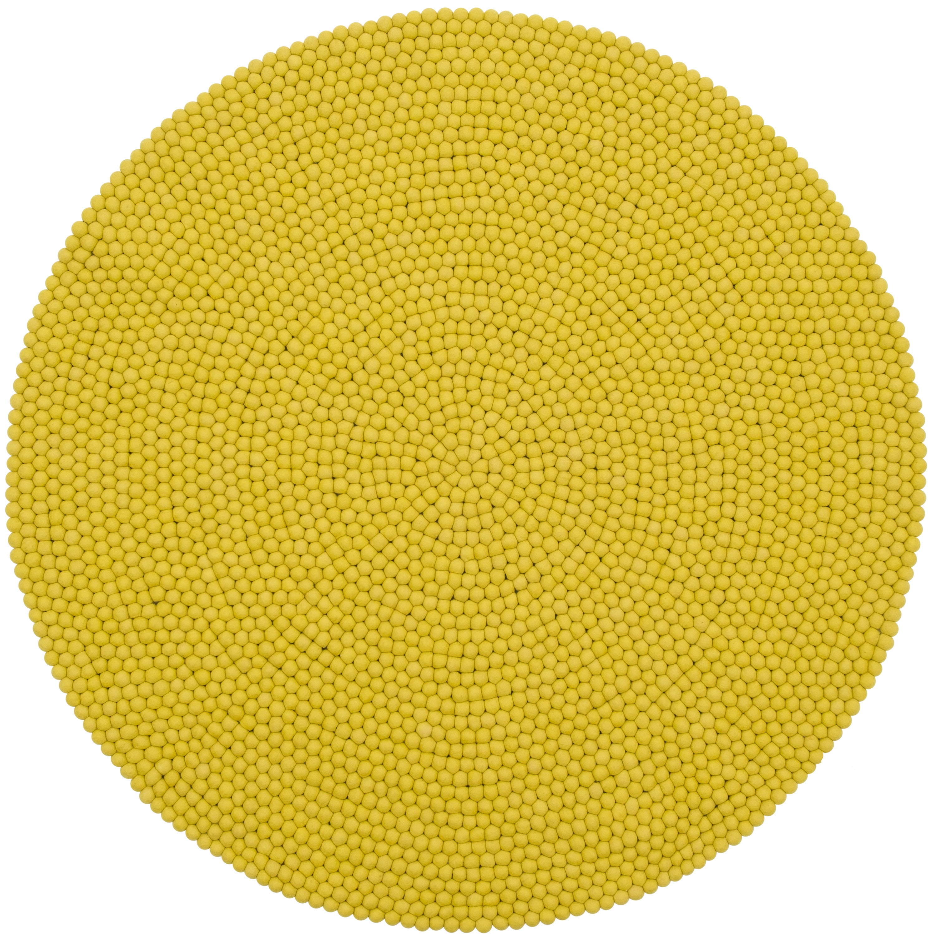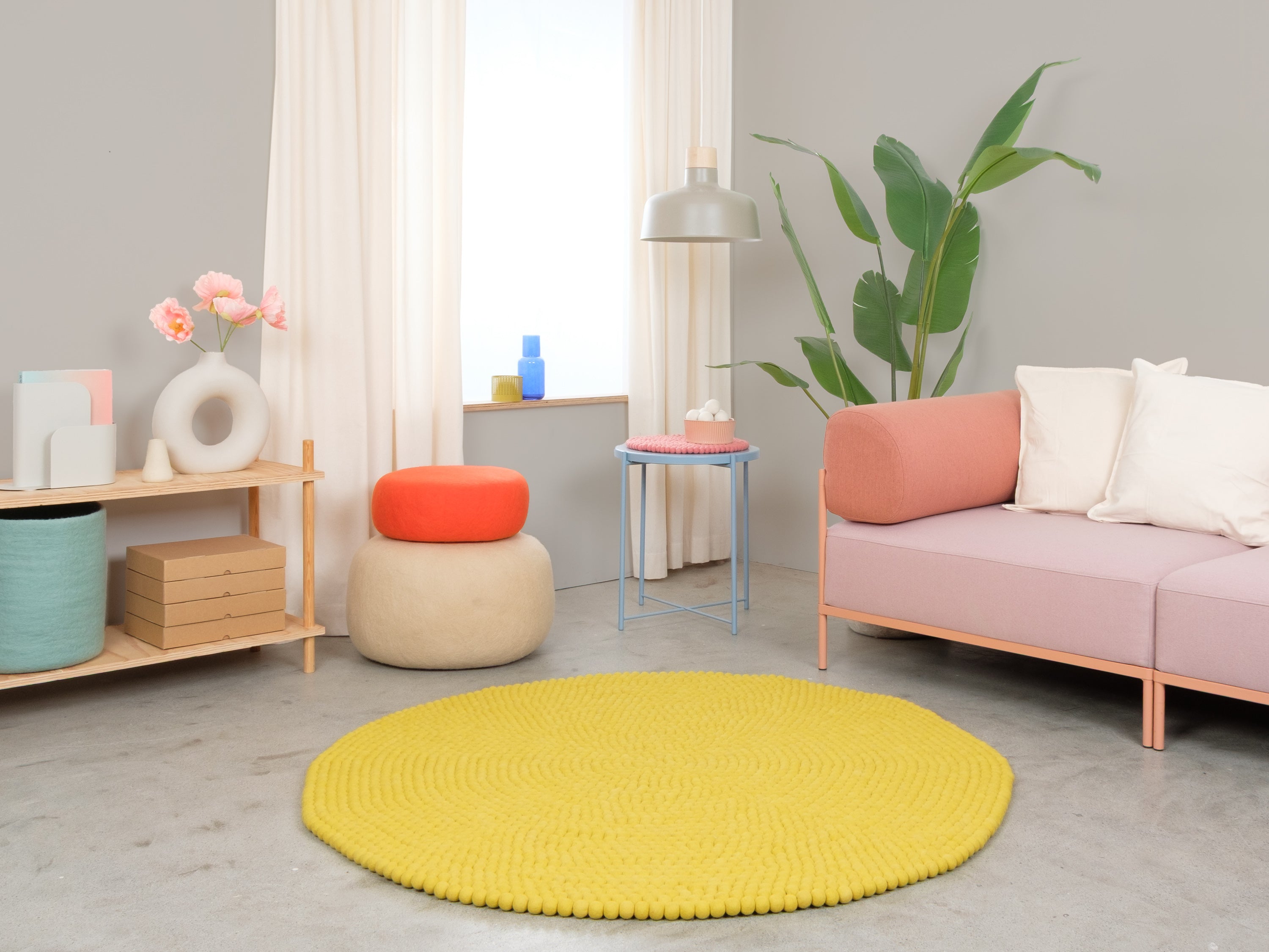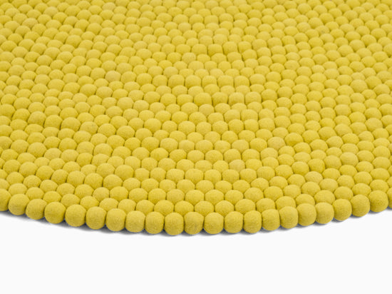 Okrągły dywan z kulek filcowych, wykonany z czystej wełny dziewiczej.
