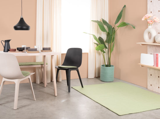 Lasse to dywan filcowy w delikatnym szałwiowym kolorze. Wnosi spokój i lekkość do wnętrza oraz harmonizuje z drewnem, bielą i naturalnymi tonami. Miękki w dotyku, trwały na co dzień i naturalnie odporny na zabrudzenia. Ręcznie wykonany w Nepalu ze 100% czystej wełny dziewiczej.