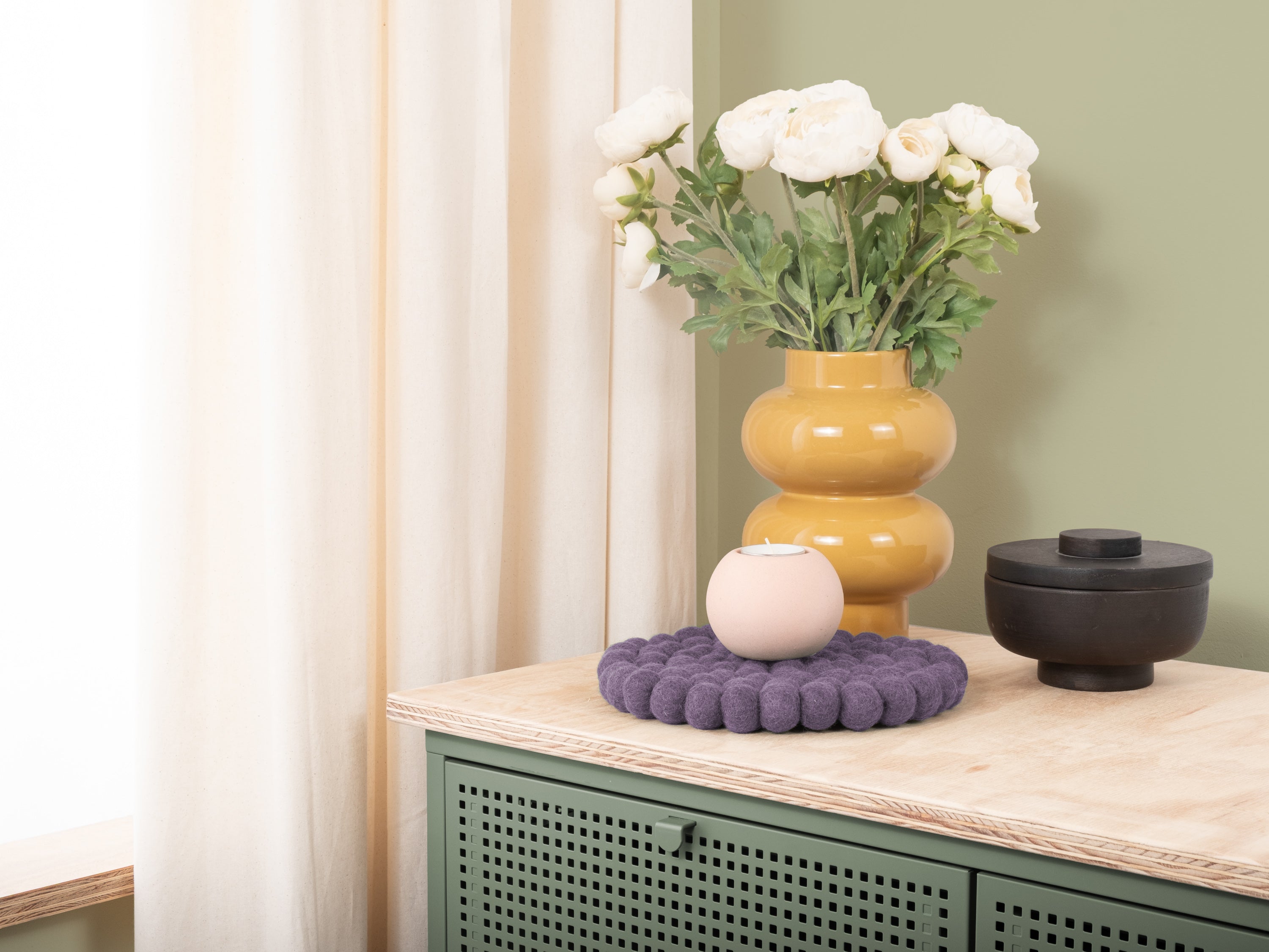 Podstawka Frida w kolorze fioletowym łączy funkcjonalność z uroczym wyglądem. Wytrzymała, odporna na ciepło, wodę i zabrudzenia oraz dwustronna. Wykonana z czystej wełny dziewiczej, ręcznie w Nepalu w uczciwych warunkach.