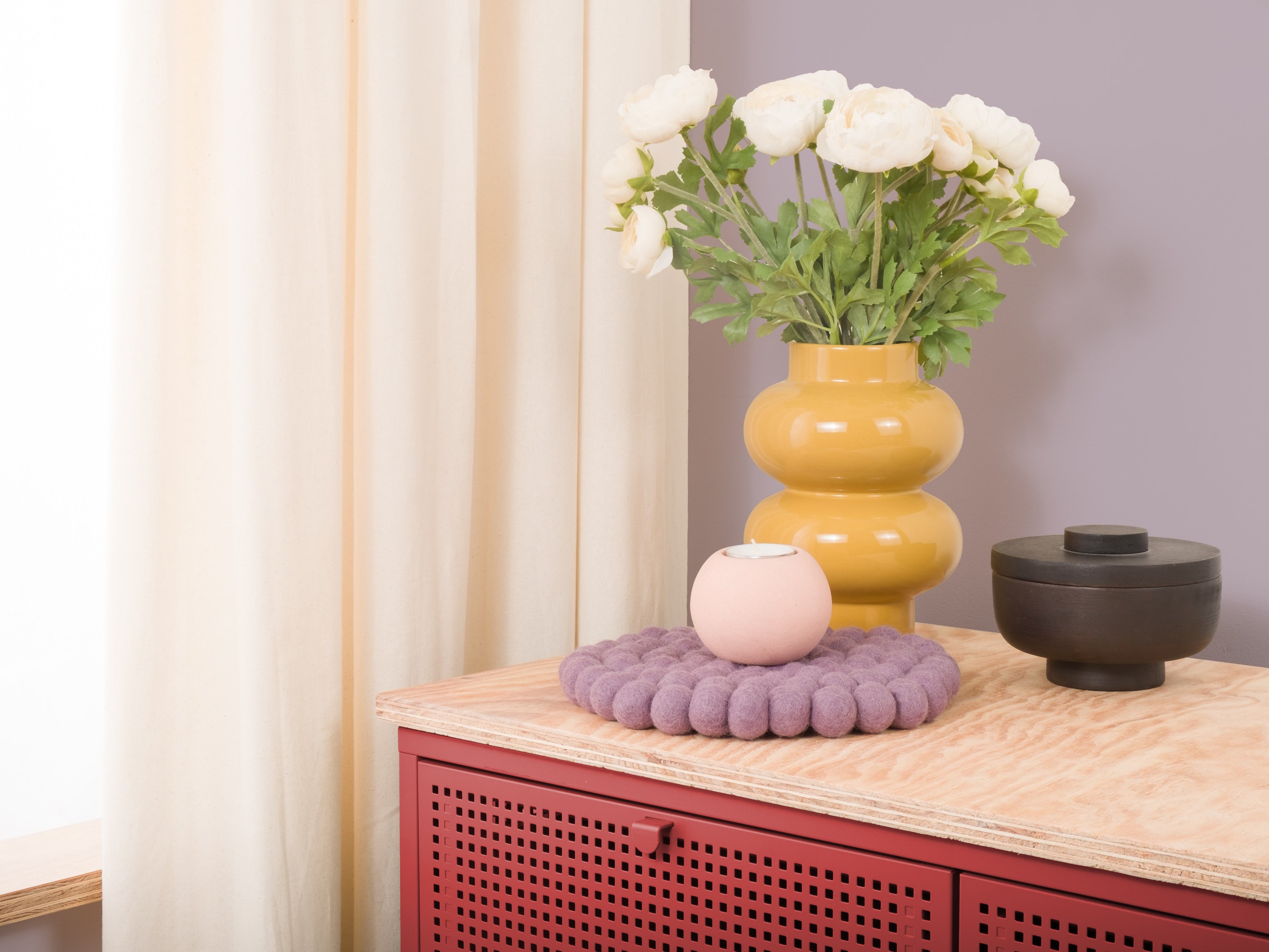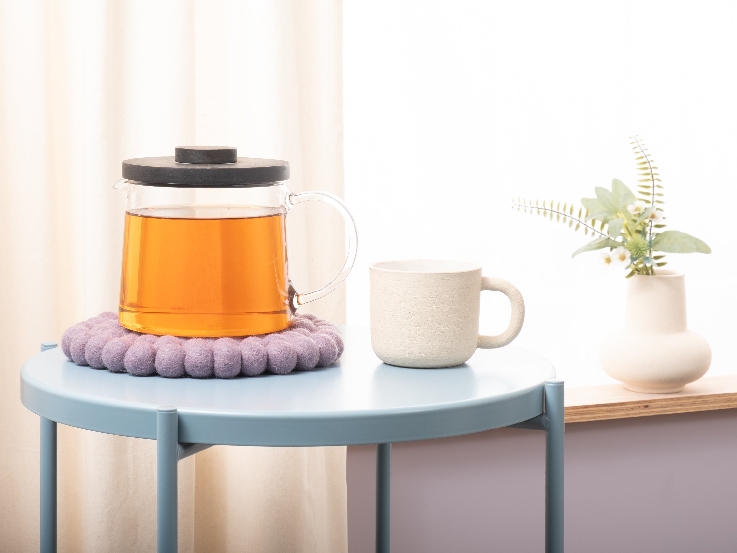Podstawka Tove w kolorze liliowoszarym łączy funkcjonalność z uroczym wyglądem. Wytrzymała, odporna na ciepło, wodę i zabrudzenia oraz dwustronna. Wykonana z czystej wełny dziewiczej, ręcznie w Nepalu w uczciwych warunkach.